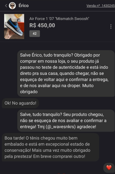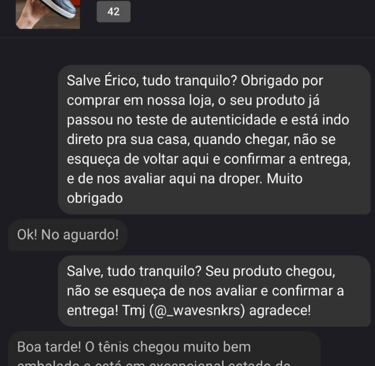 Comprei um Air Force 1 na Wave Sneakers e a experiência foi ótima. O tênis chegou bem rápido, bem embalado e 100% original, do jeitinho que esperava. Dá pra ver que a loja é séria, tudo com nota e garantia. Já quero pegar outros modelos com eles. Super indico!